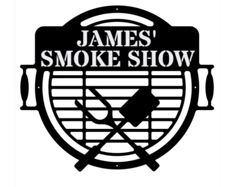 BBQ Sign Metal Wall Art, James' Smoke Show Metal Name Sign, Laser Cut Metal Sign Western Decor, Outdoor Wall Decor, Metal Shop Sign
